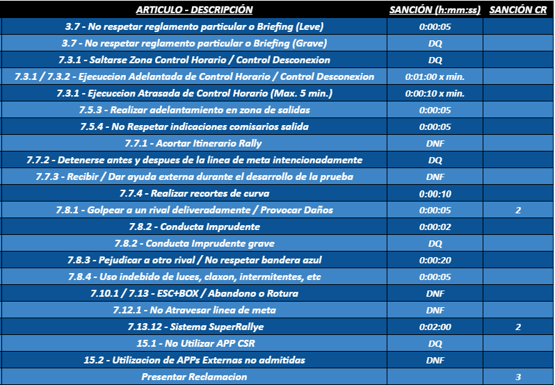 7.3.1.1 - Cada participante dispondrá de 5 minutos de retraso máximo en el paso de CH. Siendo considerado DNF, sin posibilidad de reincorporarse al TC una vez sobrepasado el tiempo, pero con posibilidad de acogerse al sistema Super Rallye bajo su reglamento.