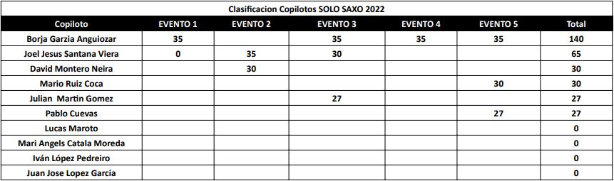 13.2 - Condiciones premios copilotos: Para la obtención de premios por parte de los copilotos será obligatorio haber participado en al menos 4 de las 5 pruebas que componen el calendario.
