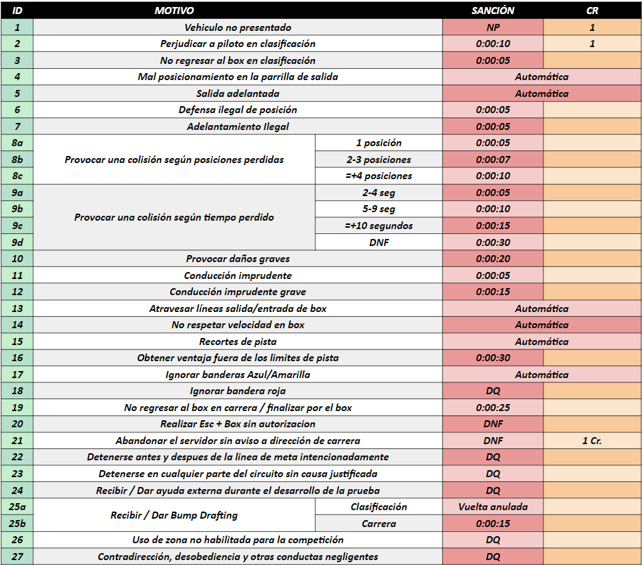 7.8.1 - No golpear a los rivales. Tanto en pista como en boxes o cualquier otra situación. Este punto será sancionable según pérdida de tiempo y posiciones o daño a los coches rivales.