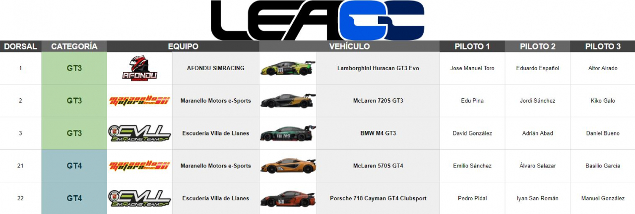 8.1.1 - División I: GT3 (todos los incluidos en el simulador)