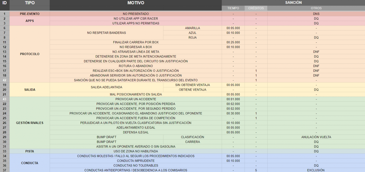 6.8.1 - No golpear a los rivales. Tanto en pista como en boxes o cualquier otra situación. Este punto será sancionable según pérdida de tiempo y posiciones o daño a los coches rivales.